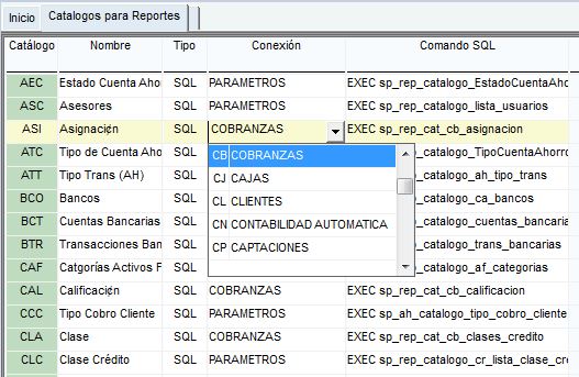 Este proceso nos sirve para modificar los datos ingresados posteriomente en sistema como tambien eliminar o ingresar nuevos datos en los Catalogos para Reportes que se registran en el sistema. A continuación la ventana de Catalogos para Reportes.