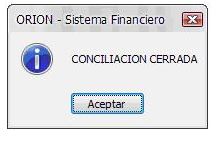 A la derecha en la parte superior, aparecen dos botones que permiten “Cerrar” la conciliación, esto es, dar la conciliación por terminada, para lo cual el saldo en bancos debe estar cuadrado, esto quiere decir que el resultado de las transacciones procesadas debe llegar al saldo ingresado como saldo en bancos a la fecha de corte. Si se marca (clic) el botón “Cerrar” aparecerá el mensaje: