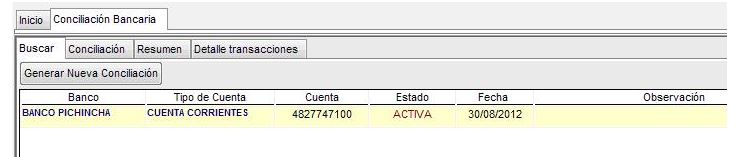 Este proceso es utilizado para revisar una conciliación bancaria generada o generar una nueva conciliación. Si seleccionamos esta opción, aparece la siguiente ventana: