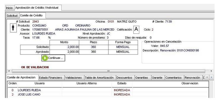 En la parte superior se muestran los datos del crédito, en la parte inferior se muestran una serie de pestañas que dan mayor información sobre la solicitud de crédito por aprobarse.