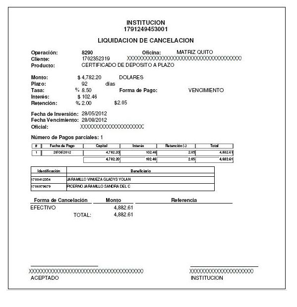 En la parte superior se muestran los datos de identificación de la inversión, la fecha de vencimiento y el detalle de los valores a liquidarse (capital, interés, penalización de interés e impuesto), así como el valor que debe recibir el beneficiario. En la parte inferior se muestra un recuadro junto a “RETIRA:” donde se puede ingresar la forma en que los intereses ganados a la fecha son pagados (EFECTIVO, CHEQUE, N/C AHORROS; TRANSFERENCIA, DOC. ADMINISTRATIVO). Si se selecciona N/C AHORROS será necesario seleccionar (bajo “Cuenta o Referencia) el número de la cuenta a la cual se va a depositar y finalmente se selecciona “Guardar” en la barra de herramientas, aparecerá el mensaje: