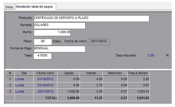 Aparecen automáticamente los datos de fecha de vencimiento, tasa de interés y tasa de impuesto en los casilleros correspondientes y en la parte inferior, aparece la tabla de amortización de los intereses y del capital a pagarse como se muestra en el siguiente ejemplo: