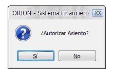 Para autorizar un asiento contable, se seleccionará (doble clic) cualquiera de los datos aparecidos en la línea del asiento contable requerido, apareciendo la siguiente ventana: