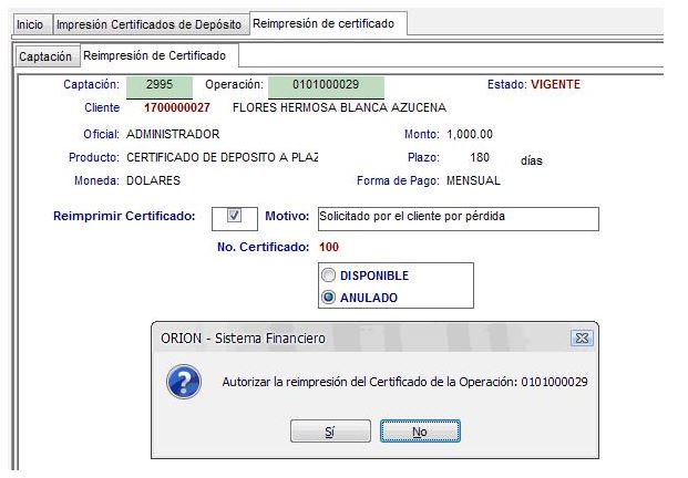 Este proceso permite imprimir nuevamente un certificado de depósito a plazo fijo que ya fue emitido Si seleccionamos esta opción aparece la siguiente ventana: